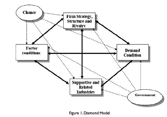 Porter's diamond model is a tool that analyzes countries or regions to describe what characterizes their competitiveness. The porter diamond model, also known as the porter diamond theory of national advantage is a business framework that describes a nation's . It's a model that can help us understand why a . Porter's diamond model, also known as the theory of national advantage, is used by different economic institutions to calculate the external . The diamond model of michael porter for the competitive advantage of nations offers a model that can help understand the competitive position of a nation in .